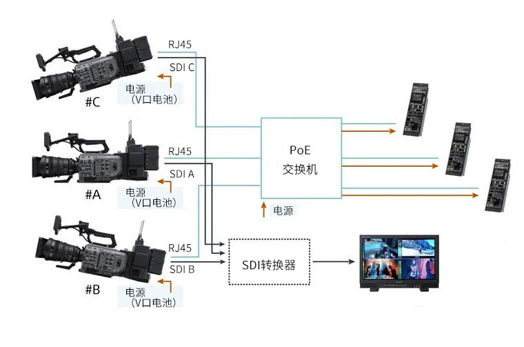 PXW-FX9支持S700以太网协议*,可为当地活动和电视演播室制作提供简单、易于操作的多机位控制。可选购的XDCA-FX9扩展单元(带RJ45插孔)可通过以太网从单个RCP**装置接受S700协议控制,或者可通过PoE交换机控制多个FX9,每个FX9使用一个RCP。SDI上的A/V输出可通过标准SDI转换器进行路由,PVM-X2400等监视器可同时显示多达四路HD输入。