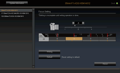 因应适马的全新产品线, 我们研发出适马独有的特设软件(SIGMA OptimizationPro), 从此便可自由更新镜头韧体,或调校如对焦位置等其他范畴; 利用特设的USB DOCK,把镜头和计算机链接,在计算机屏幕上,简单轻松地自行调校,制作出自己的特定个人规格, 以迎合每人各自不同的偏爱。
